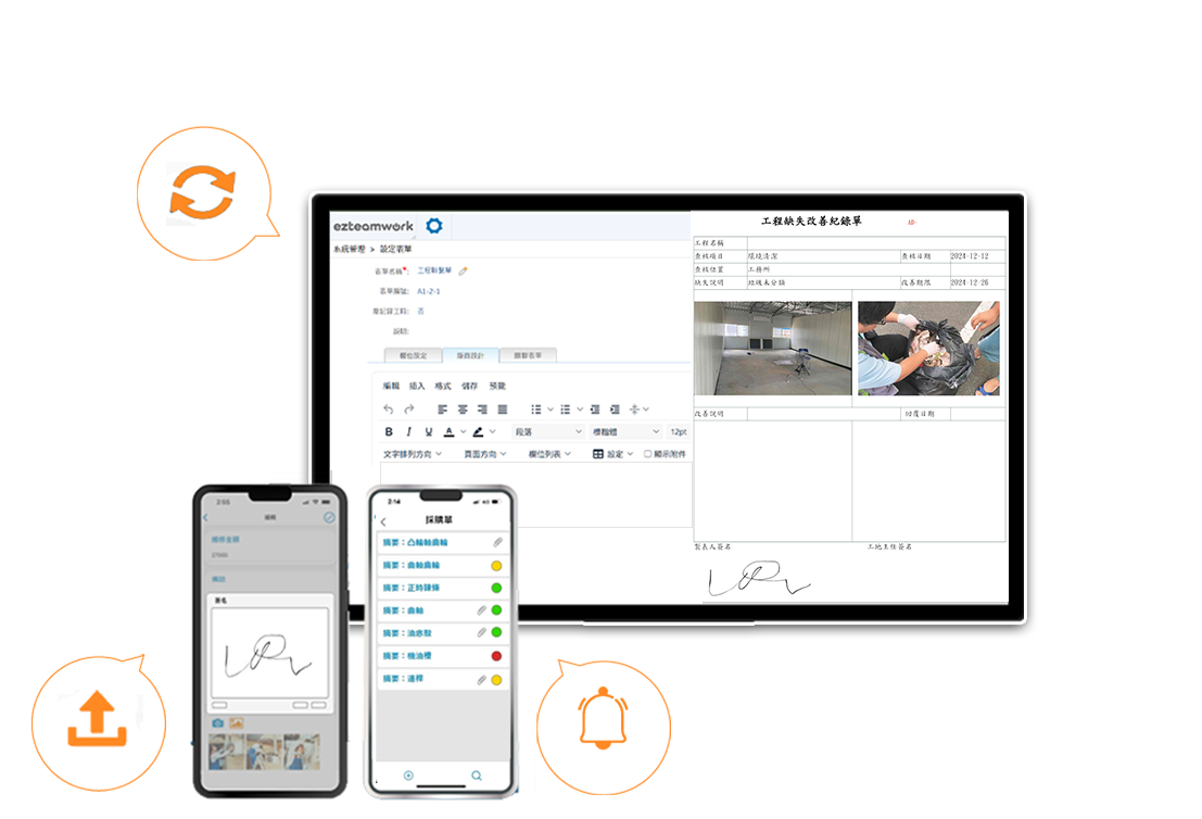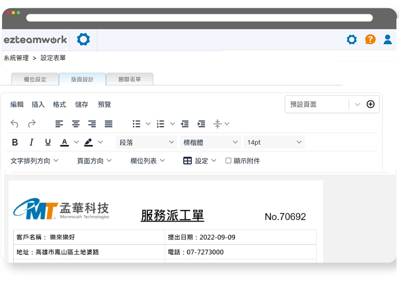 eWorksheet提供完善的電子表單管理機制,可依企業或團隊的管理需求自訂多種類型的表單,並自行設計表單的欄位與排版,讓企業能夠因應各式應用情境或表單需求進行彈性的調整與設計。